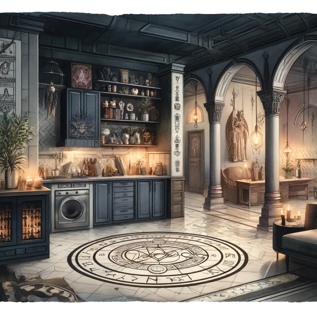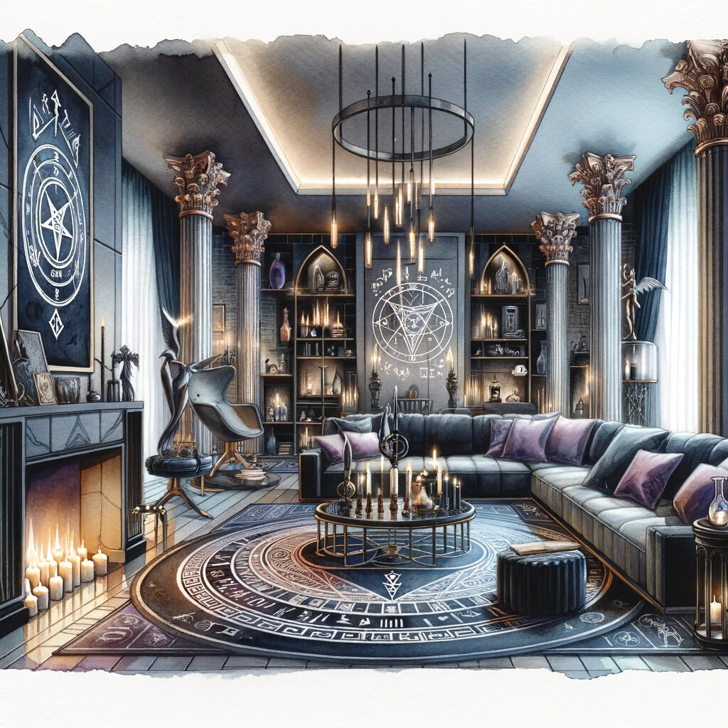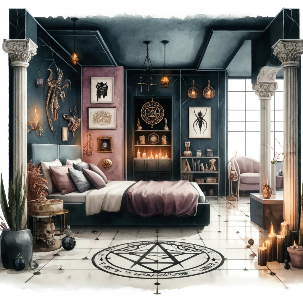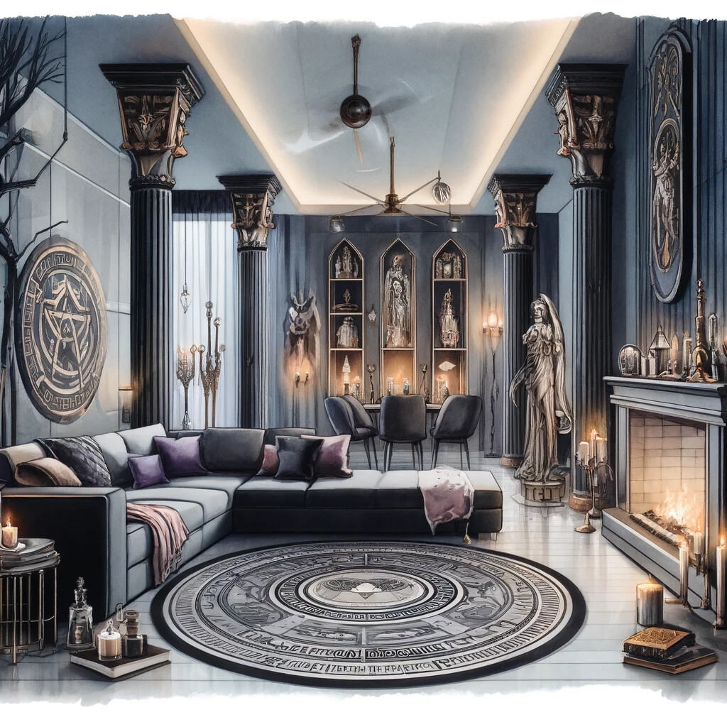 Looking at this spiritual temple, I wondered what our physical space would look like with this kind of treatment given to it. So, I asked DALLĀ·E to magickify photos of our apartment, and this is what it came up with. It doesnāt really have much of a clue with what itās looking at, but I love the ideas. (I didnāt ask for everything to be purpleāit came up with the colour schemes on its own.)
