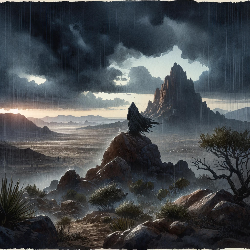 Rocky terrain: Itās dusk, raining, sky is blackish grey, and itās windy. Thereās not many plants, itās like a rocky dessert but as itās quite dark itās difficult to see, there are a few trees and shrubs. In the distance clear in view is a mountain, with Loki stood on top. He appears in a hooded cloak, all in black, with a staff, and the cloak is blowing around, no face just shadow.