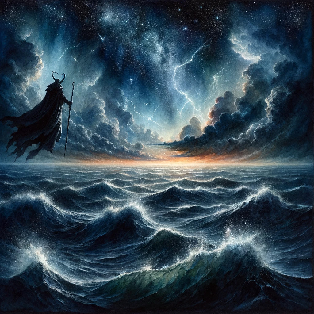 The storm, is Iām hovering above the water, so again the sky is grey and itās raining (itās always raining except in the library). I can see the stormy waves, Iām looking down on the stormy waves, this time thereās no other land itās just sea and sky. Loki again is hooded but no staff, face again shadow but heās above the sea too, hovering looking back at me. (Thatās door 2)