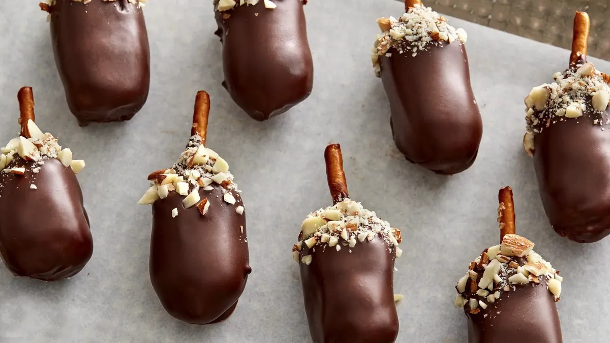 Remove one-third of the cookie acorns at a time from the refrigerator. Place on second waxed paper-lined cookie sheet. Carefully holding a chilled cookie acorn by a pretzel stem, hold it over a bowl of melted chocolate. Using a spoon, spoon melted chocolate over the cookie acorn to cover. Gently shake off excess chocolate.