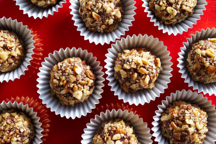 Working quickly and using a small warmed teaspoon (dipped into hot water and then dried), scoop chilled chocolate mixture by 2-teaspoon portions, and shape each into a ball. Place each ball on chopped pecans. Once the plate is filled, wash your hands and roll the balls in pecans to completely cover. Transfer balls to a parchment paper-lined baking sheet. Repeat with the remaining chocolate mixture and pecans.