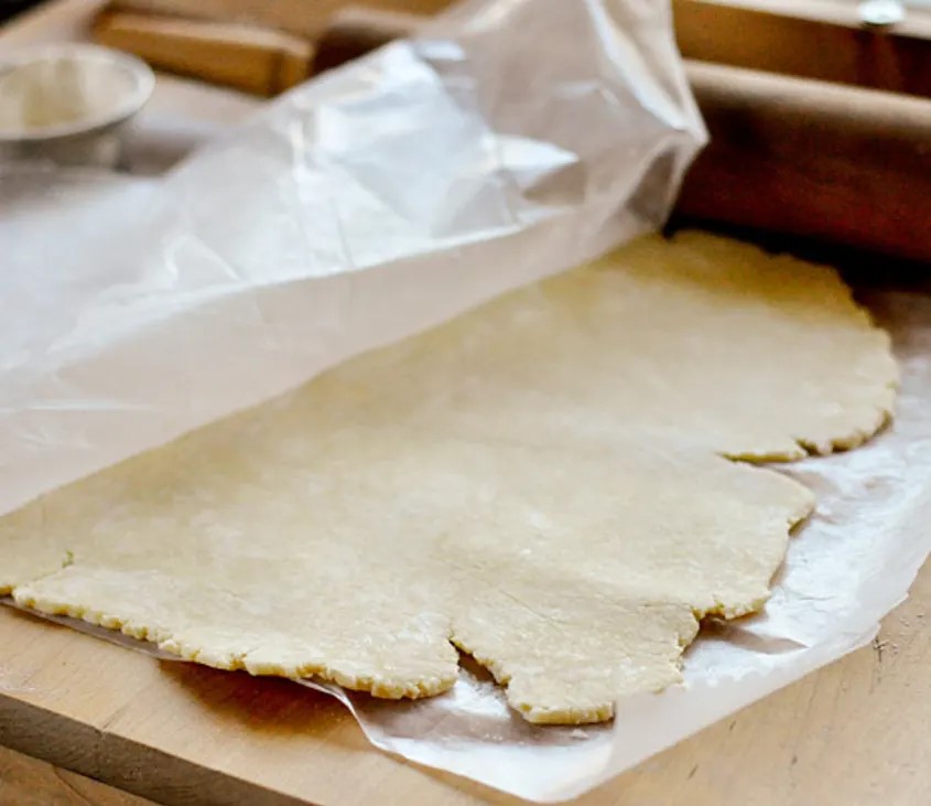 Roll Out the Pie Crust - Tear off two large pieces of wax paper. Unwrap one of the pieces of dough and set it in the center of a piece of wax paper. Lay the other piece on top. Working from the middle of the dough out, begin rolling the dough into a thin crust. The dough will be tough to roll at first, but then then will gradually become more malleable as it becomes thinner. Rotate the dough and flip it to the other side a few times as you roll. Peel back the wax paper occasionally and sprinkle the dough with a little flour to make sure it doesn’t start to stick.
