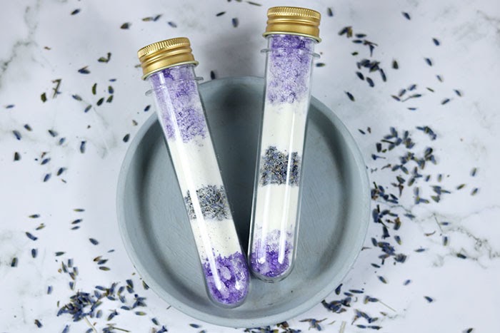 Dump the entire test tube in running water to make an herbal bath soak. You’ll get the lavender milk bath benefits from the salts, lavender and dry milk.