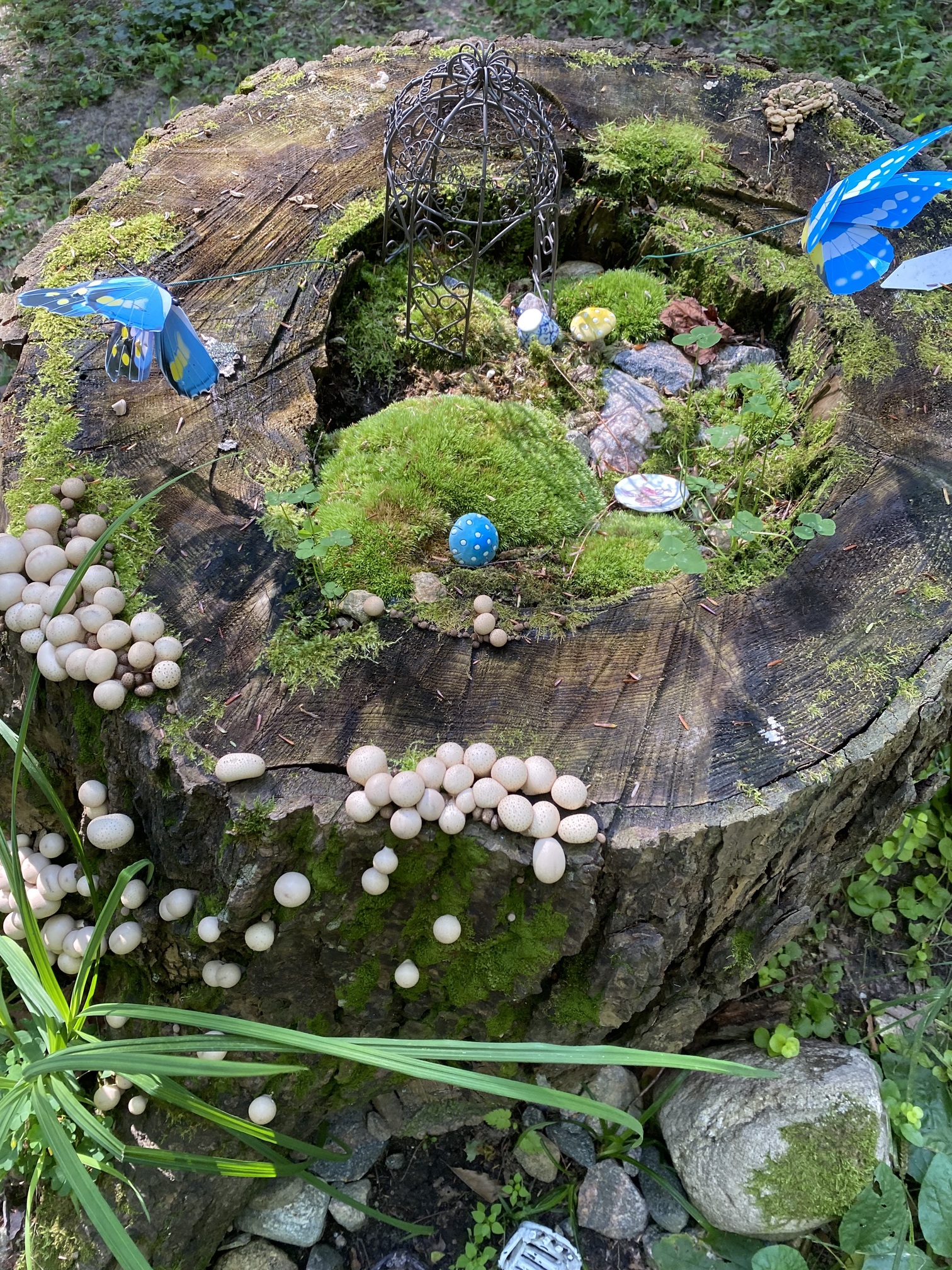 The white puff ball mushrooms on the stump are real! I have no idea whether they are edible or not though. We have a gnome but not near any of the fairy gardens:mushroom: