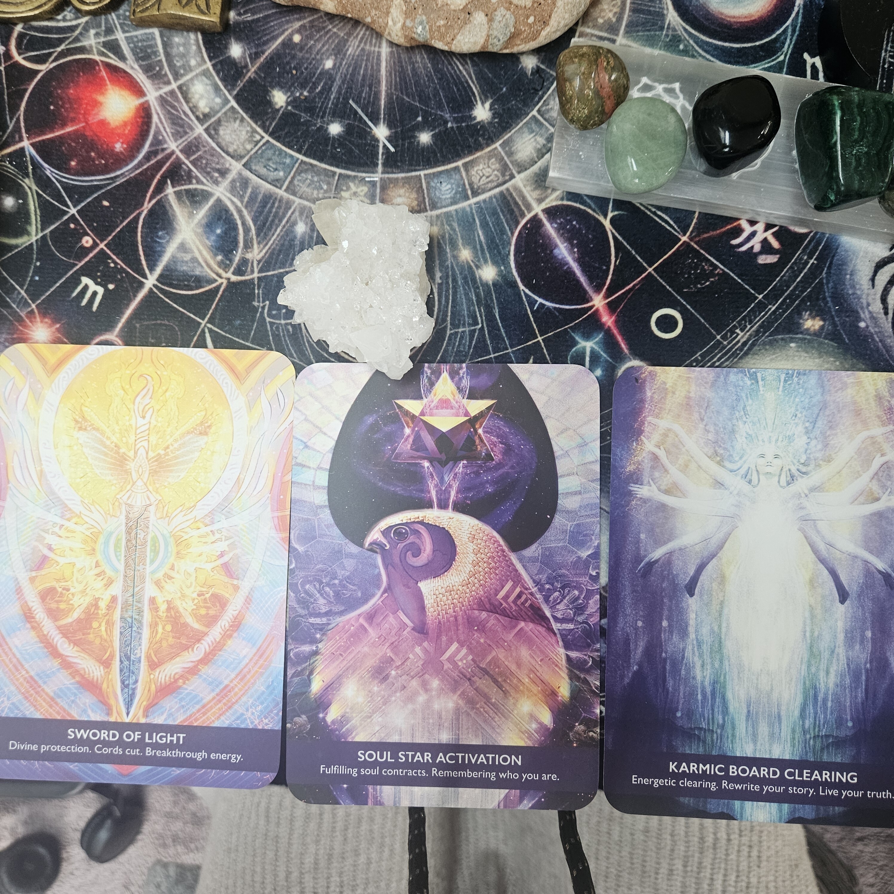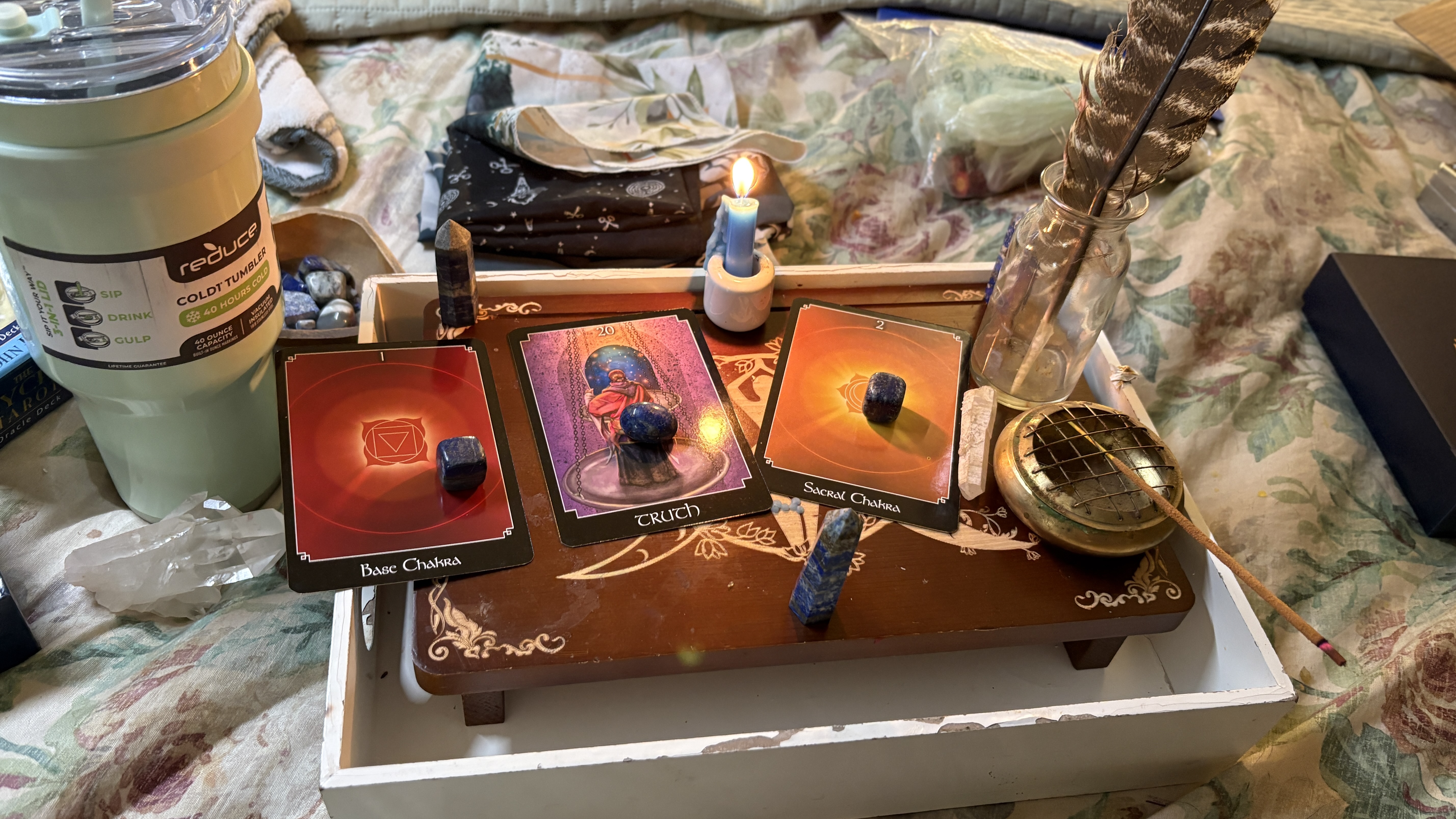 “This week, I pulled Root, Sacral, Throat, and Truth. The message was about grounding in what I have, honoring what I want, speaking my truth, and awakening to higher alignment. I’d love for us to explore these themes together.”.