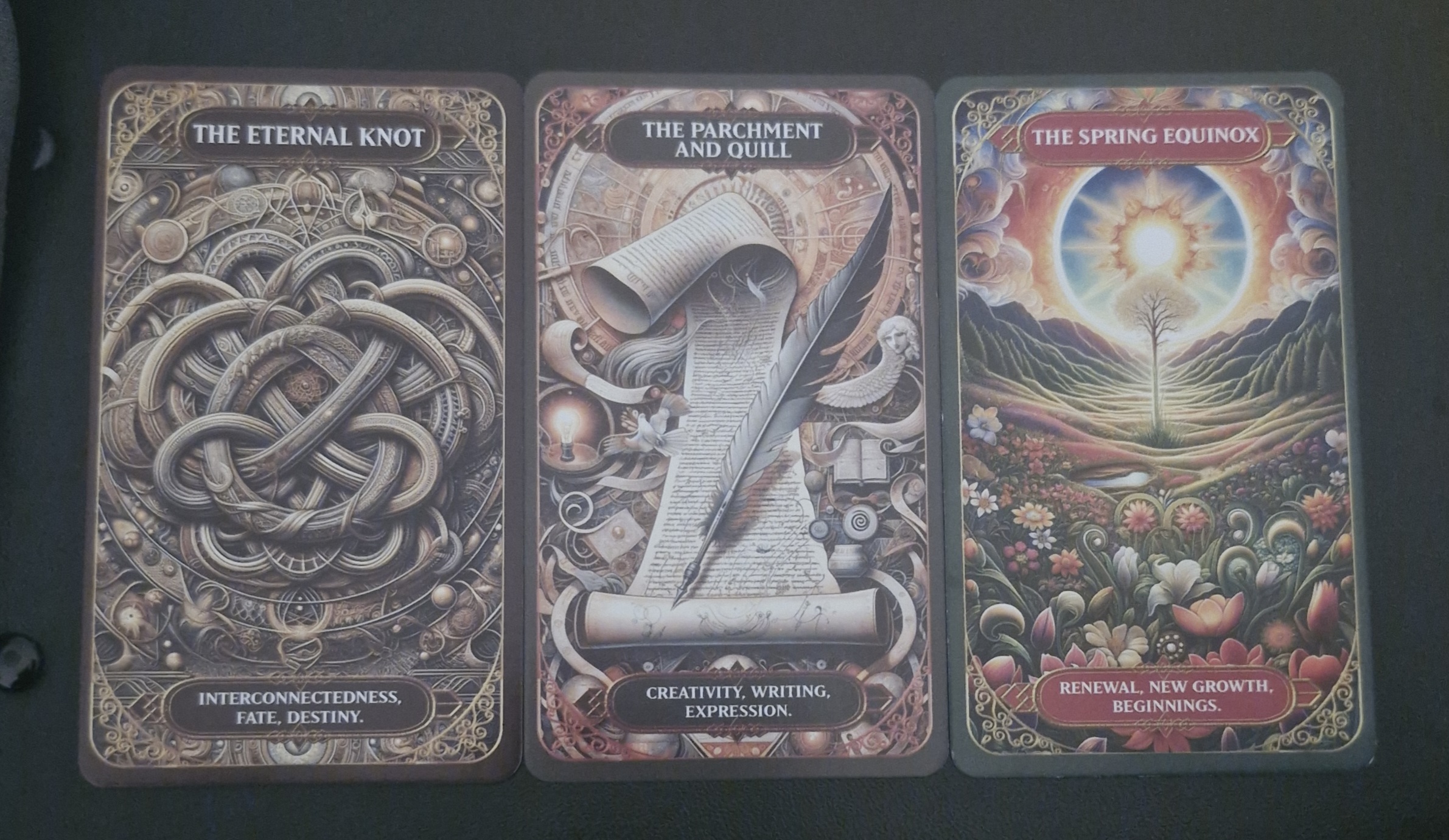 Keep doing this! It helps. I got my first set of oracle cards about 1 1/2 months ago. I have two now, I just got the Earth and Bone Oracle. It really resonates with me. I am trying to read runes as well. I am teaching myself to read both. It is hard but fun at the same time.
