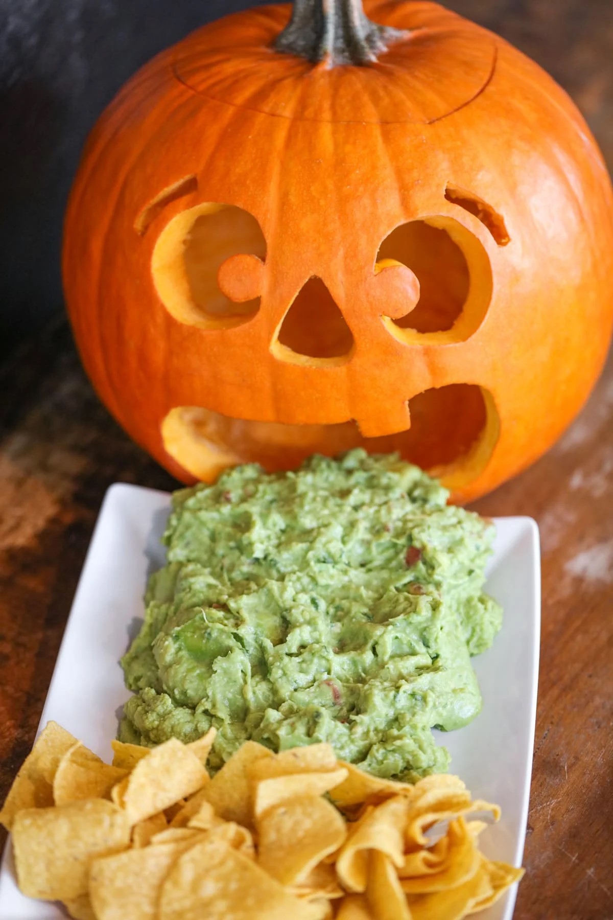 A Puking Pumpkin with guacamole is SO easy to make and tastes delicious. It is perfect for any Halloween celebration!