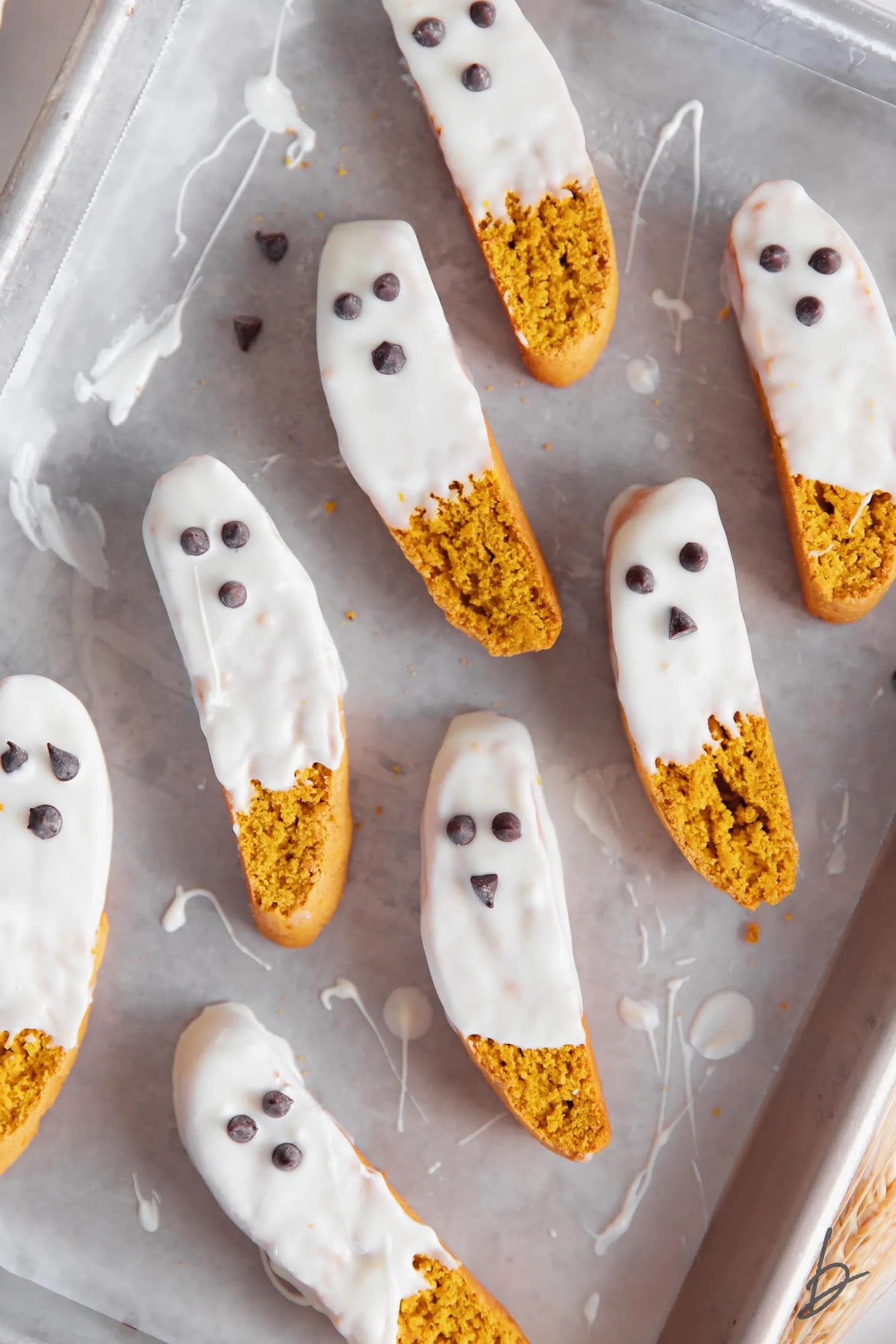 Place white chocolate melting wafers in a microwave-safe bowl. Heat for 1 minute on 50% power level, stopping to stir halfway through. Stir until smooth. Dip biscotti in the white chocolate and allow the excess chocolate to drip off before transferring to parchment paper. Add mini chocolate chips for the eyes and mouth if decorating.