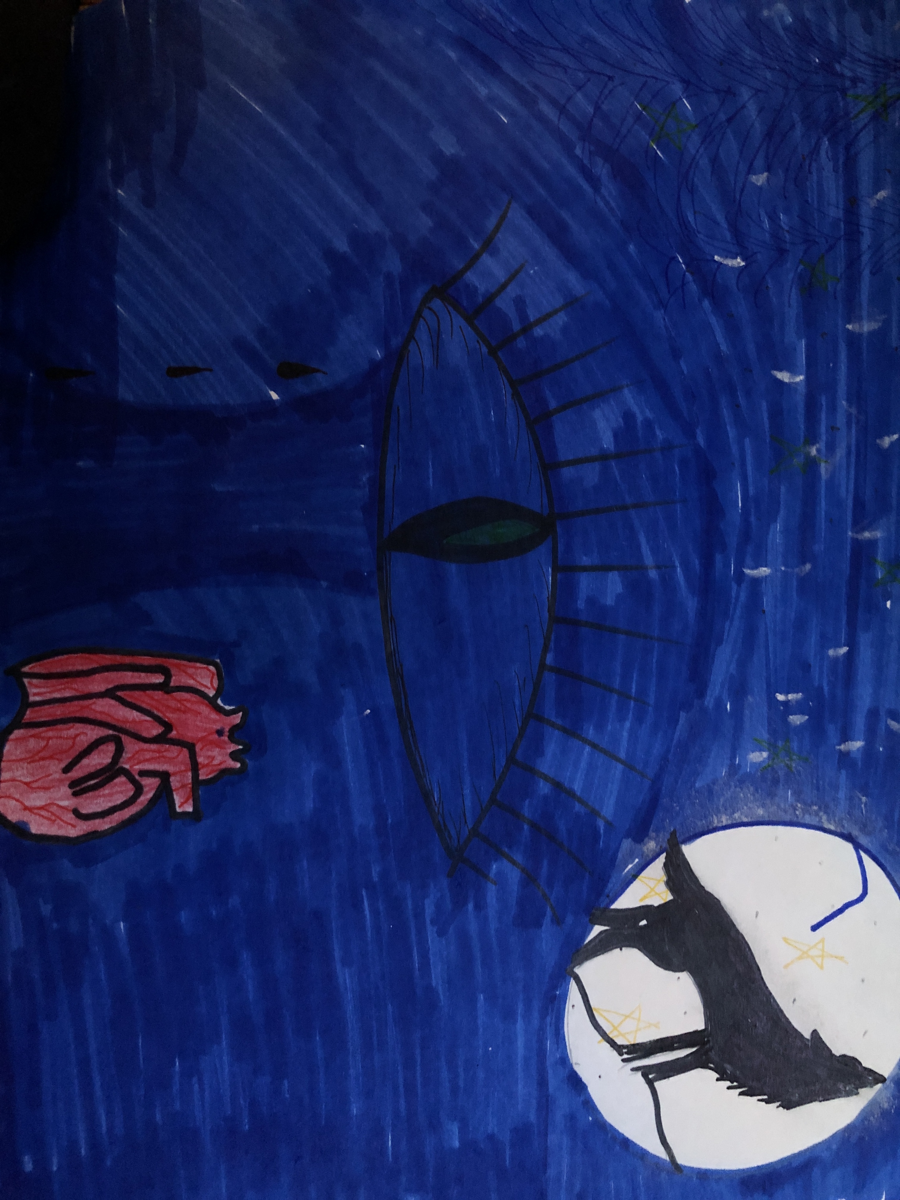I stood up all night drawing and this is what I came up with during the full moon! I wanted to express myself through art! It looks like a kids drawing! I am not perfect by any means! I am at least trying to work on myself! I feel empowered by that!