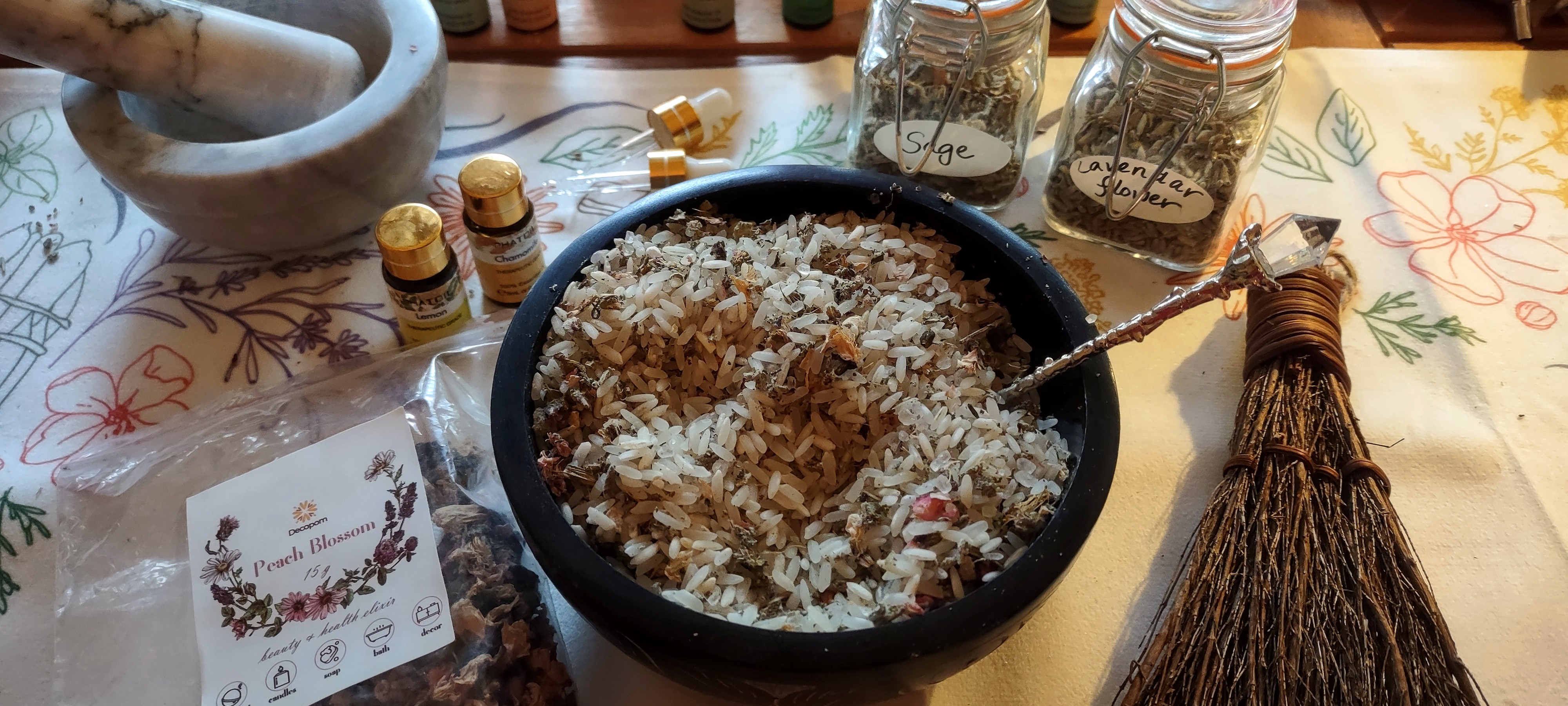 White rice mixed with 13 drops of Sandalwood oil and 13 drops of Ylang Ylang oil.