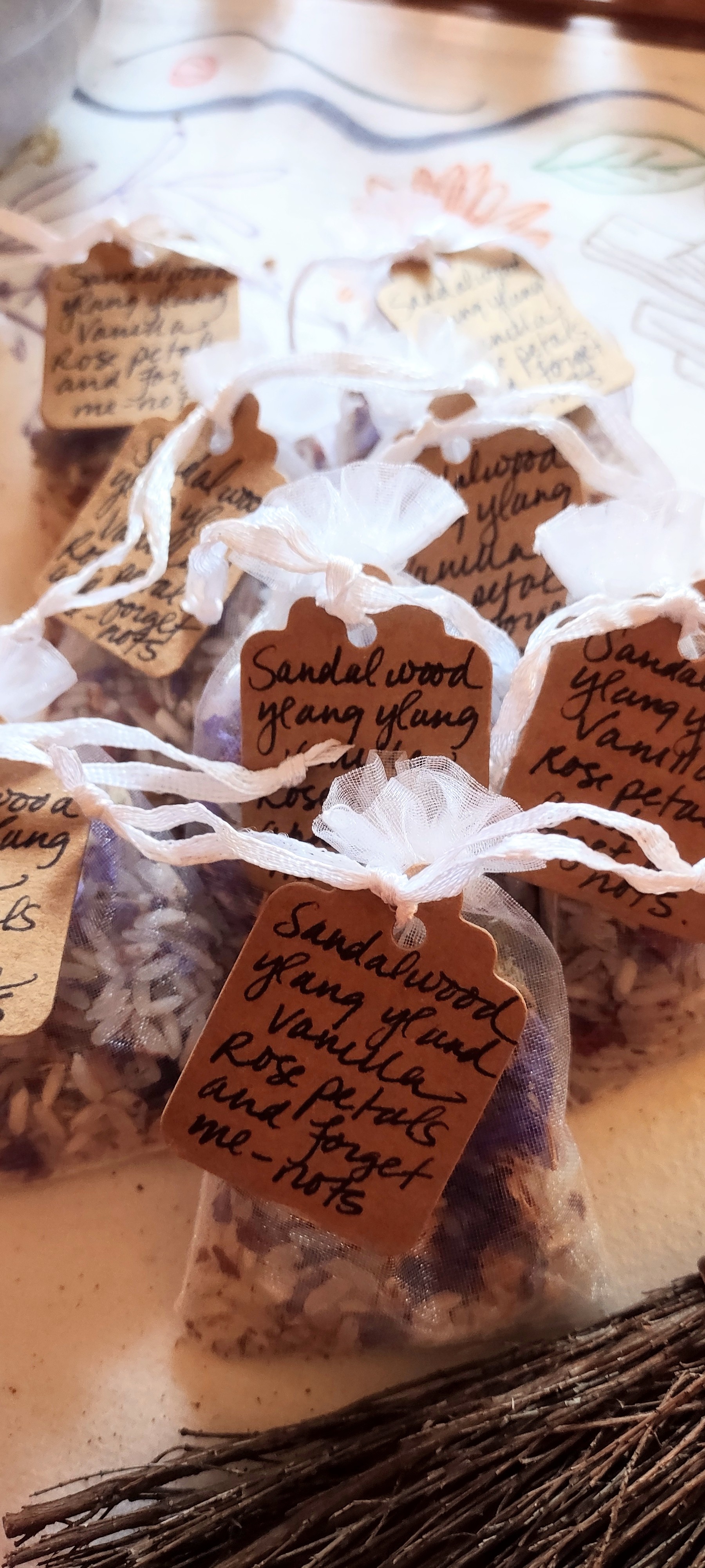 I picked some of my essential oils, dried flowers, herbs, lavender Epsom salt, and rice to concoct some scented sachets!